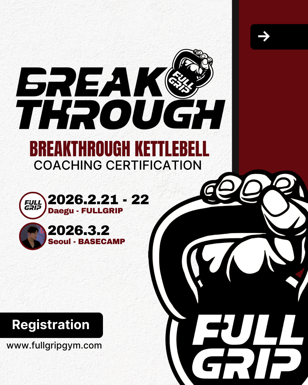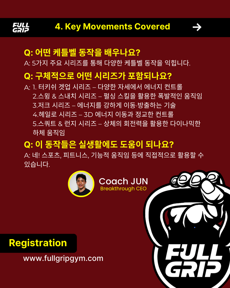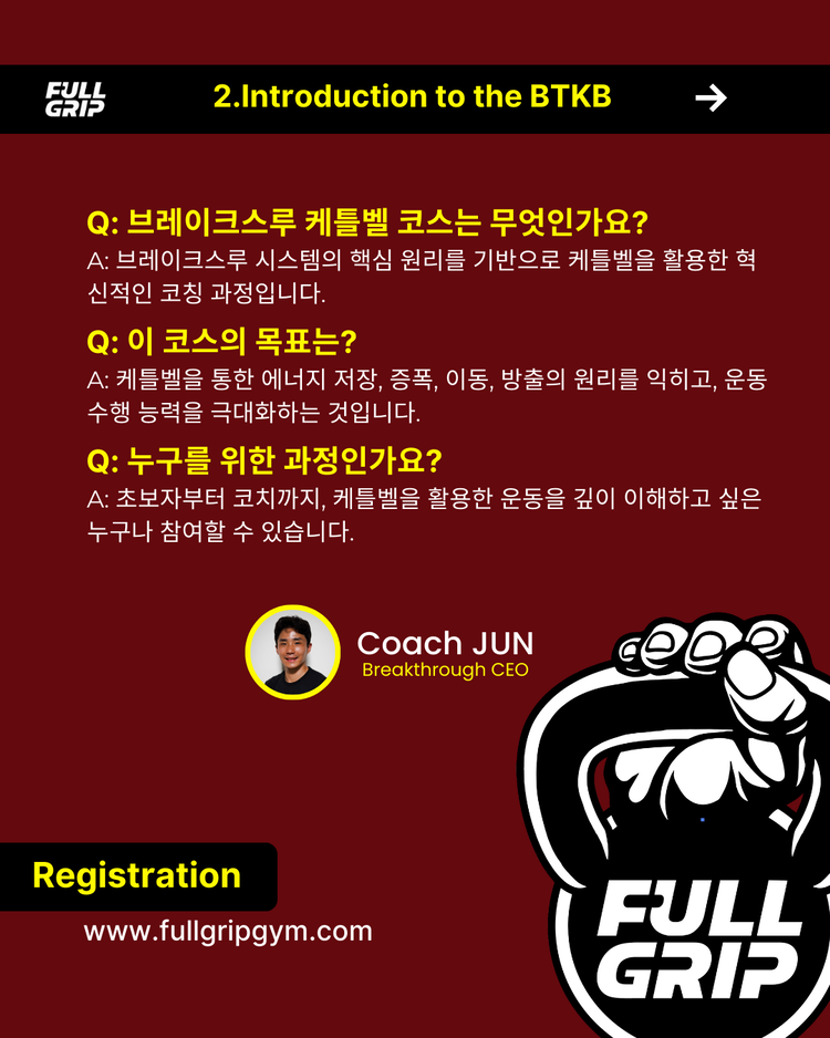 이 코스는 모든 참가자에게 케틀벨을 활용한 효과적인 훈련 방법과 더불어 자신만의 운동 루틴을 창조하고 개선할 수 있는 시간이 될 것입니다. 브레이크스루 케틀벨 코스로 훈련의 새로운 차원을 경험해 보세요!